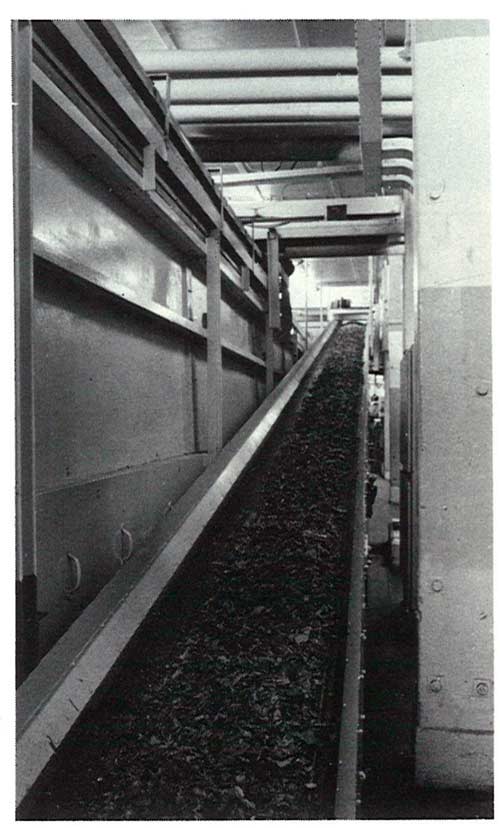 PVC-transportband voor tabakstransport. De transportband is aan de