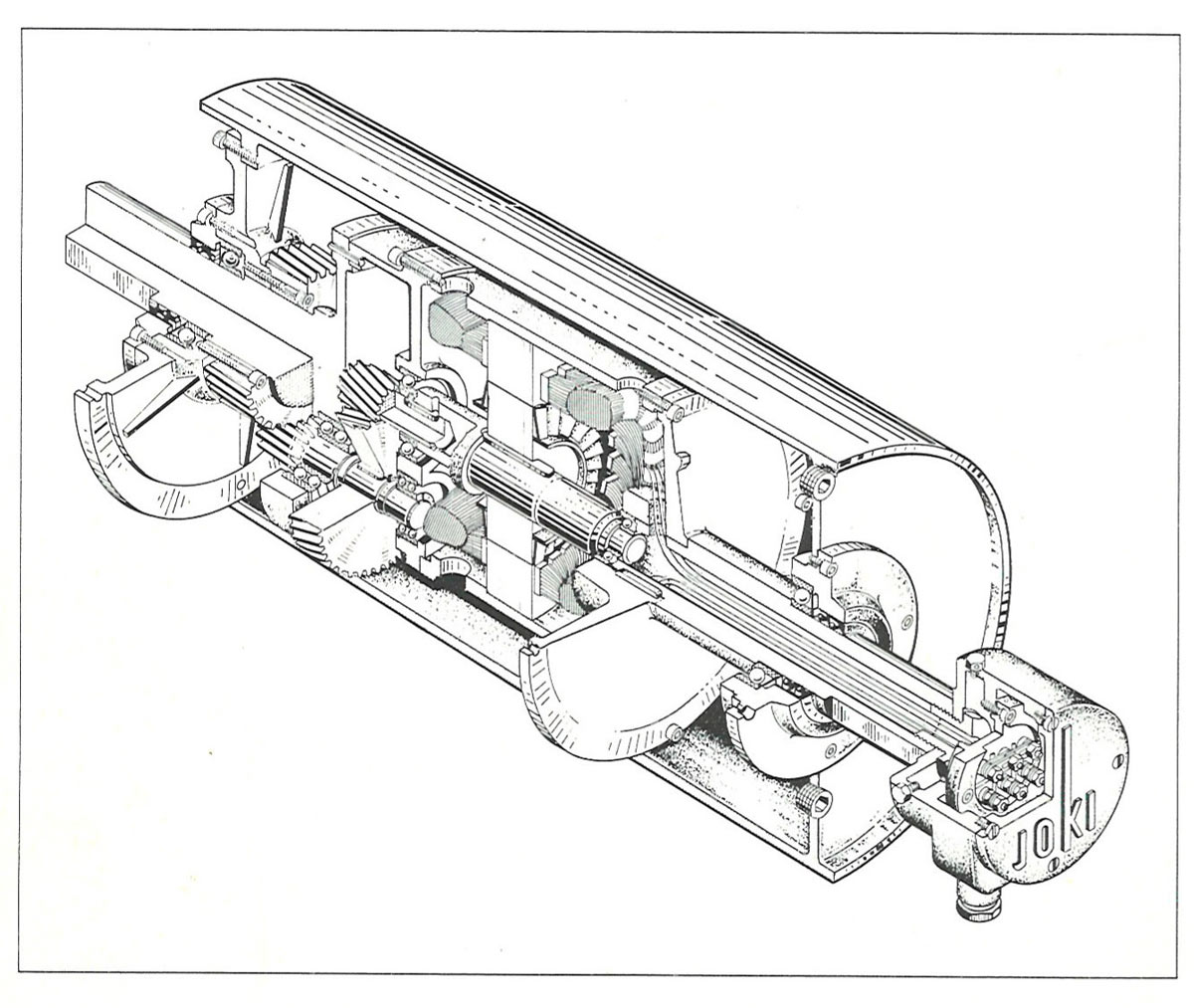 de olie gekoelde Joki trommelmotor, waarbij zowel elektromotor als tandwielkast